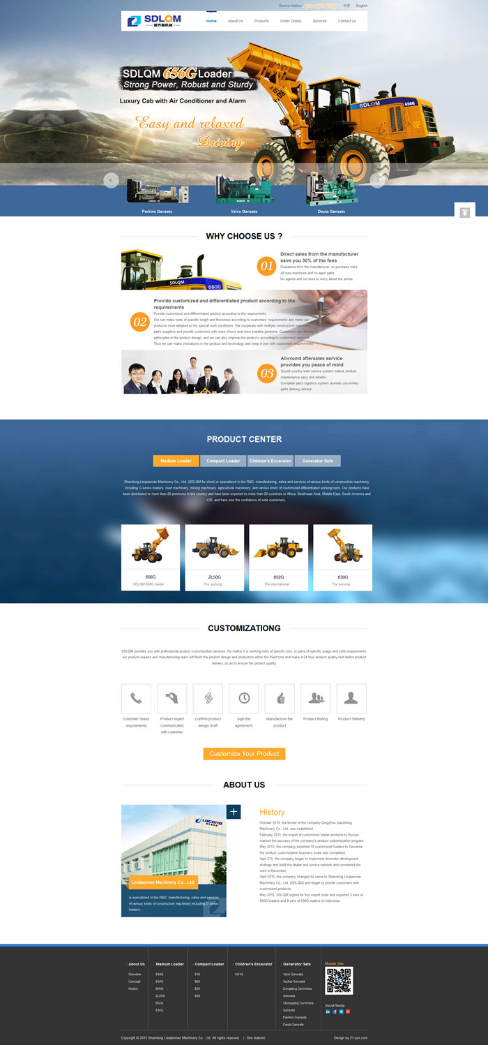 山东雷乔曼机械有限公司是实现互联网选配购机的工程机械企业,成立于2010年10月,集科技研发、生产制造、销售服务为一体,主要生产G系列装载机、筑路机械、采矿机械、农业装备机械及所有满足客户需求的差异化工作机具,产品畅销全国20多个省、市、自治区,并出口非洲、东南亚、中东、南美、独联体等二十多个国家,深受广大客户的信赖。秉承着顾客至上,质量为本理念,视客户为衣食父母,愿以优质的产品、优惠的价格和满意的服务真诚合作,共创辉煌。
